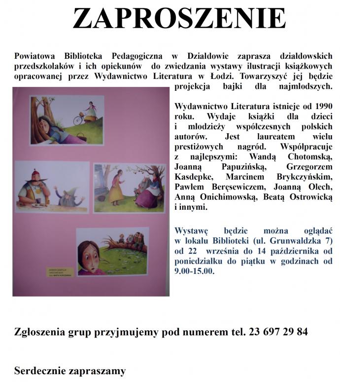 Powiatowa Biblioteka Pedagogiczna w Działdowie zaprasza działdowskich przedszkolaków i ich opiekunów do zwiedzania wystawy ilustracji książkowych opracowanej przez Wydawnictwo Literatura w Łodzi