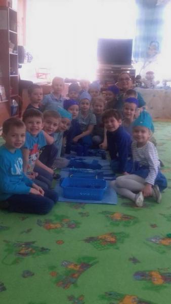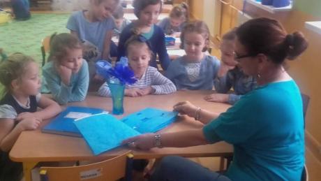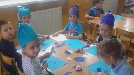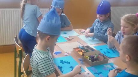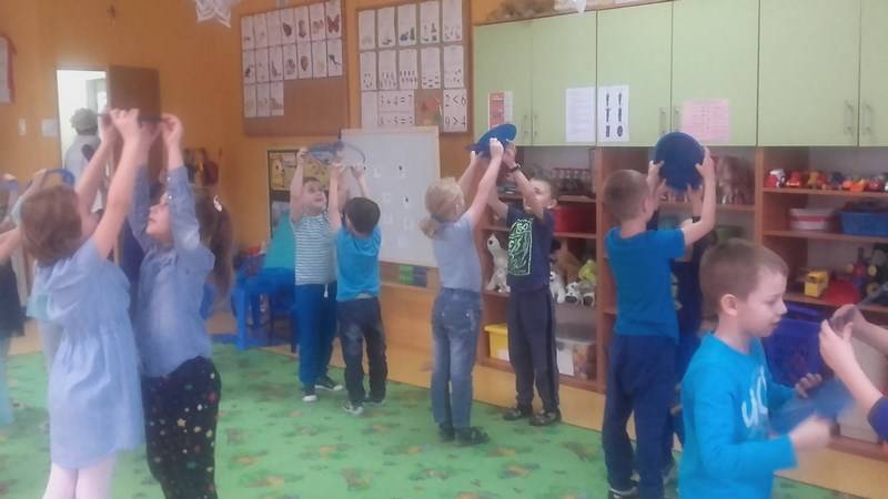 Na zajęciach zorganizowanych 6-latki wykonały na niebieskich kartkach prace na dowolny temat, dowolną techniką. W wyniku twórczości plastycznej dzieci powstała "NASZA NIEBIESKA KSIĄŻKA" - do kolekcji książek wykonanych w grupie. Następnie był czas na relaks przy muzyce, zabawa integracyjna naokoło niebieskiego dywaniku. Dzieci w niebieskich czapeczkach uczestniczyły w zajęciu muzycznym. Uczyły się piosenki "Ekologia", zgodnie z przerabianą tematyką.