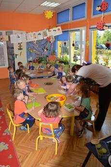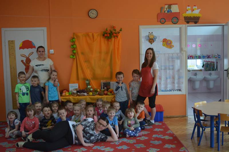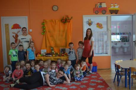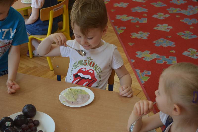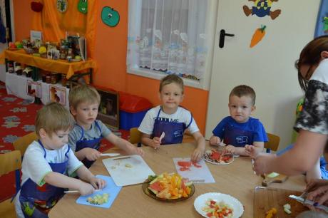 Maluchy poznawały owoce za pomocą wszystkich zmysłów (smak, węch, dotyk), ich wartości odżywcze i zastosowanie. W ramach projektu odbyły się zajęcia matematyczne, plastyczne, muzyczne oraz kulinarne, na których przygotowywaliśmy sałatkę owocową, naturalne jogurty i soki.