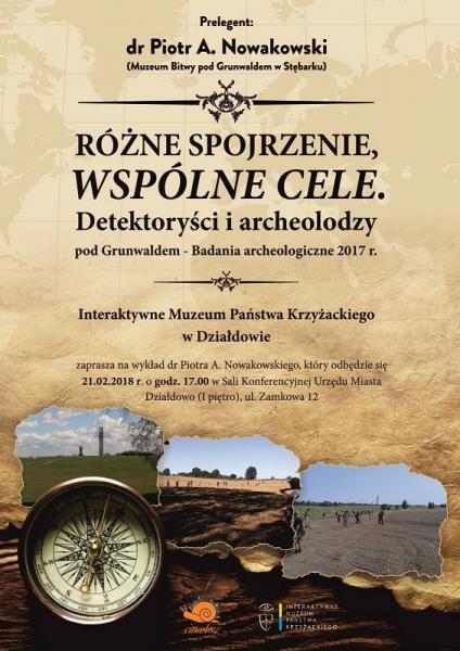 Interaktywne Muzeum Państwa Krzyżackiego w Działdowie zaprasza na wykład dr Piotra Nowakowskiego pt.: "Różne spojrzenie, wspólne cele. Detektoryści i archeolodzy pod Grunwaldem - badania archeologiczne 2017 r.", który odbędzie się 21 lutego 2018 r. o godz. 17.00 w Sali Konferencyjnej Urzędu Miasta Działdowo (I piętro), ul. Zamkowa 12. Materiał: Interaktywne Muzeum Państwa Krzyżackiego
