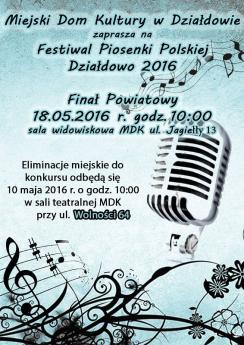18 maja 2016 roku w sali widowiskowej MDK w Działdowie przy ul. Jagiełły 13 odbędzie się finał powiatowy kolejnej edycji Festiwalu Piosenki Polskiej.