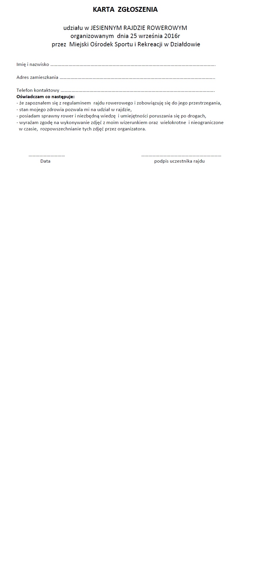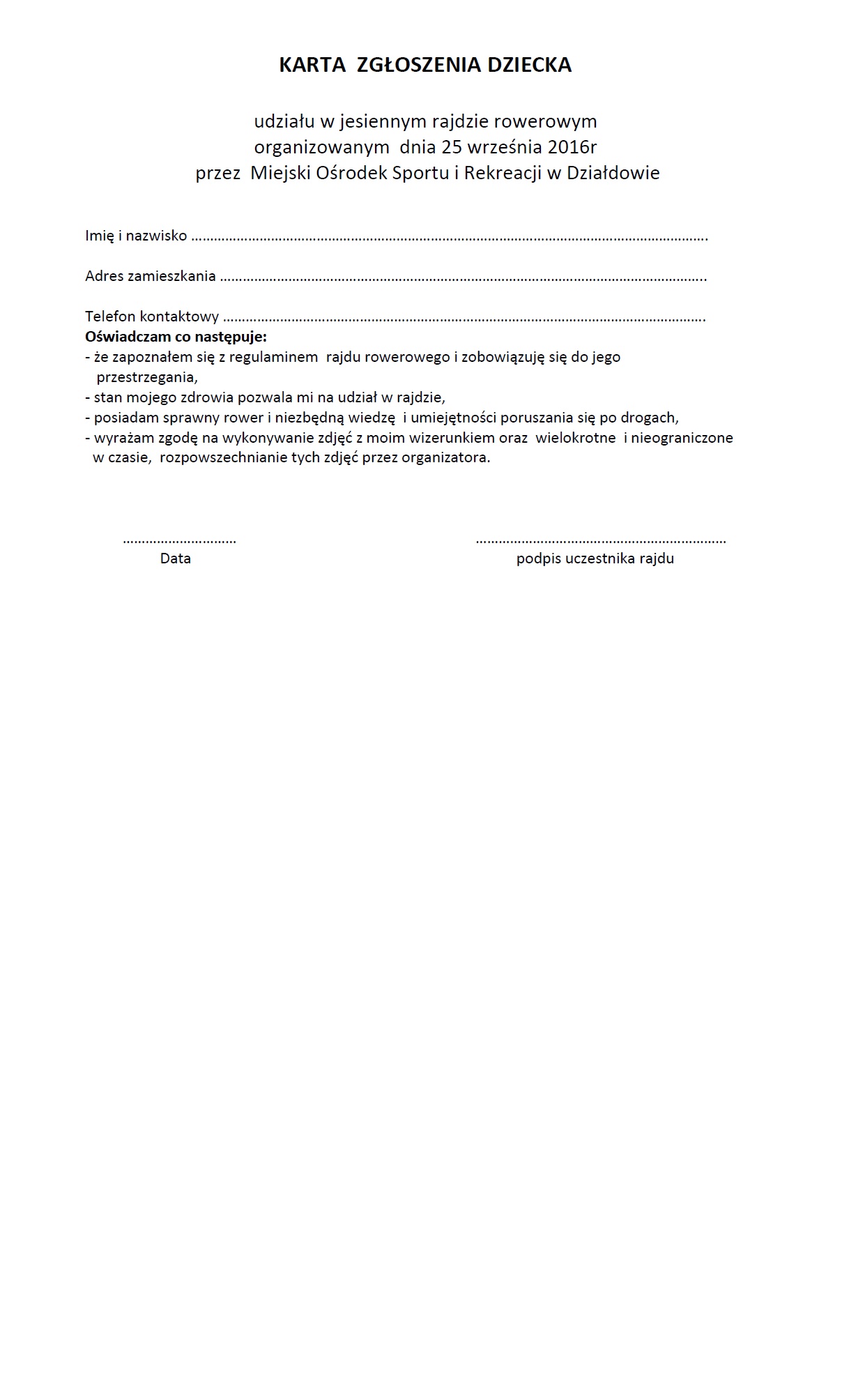 Wszystkich uczestników rajdu obowiązuje wcześniejsze, pisemne zgłoszenie udziału w rajdzie w biurze MOSiR-u. Karty zgłoszenia i zgody rodziców do odebrania w biurze MOSiR-u lub do pobrania na www.mosirdzialdowo.pl.