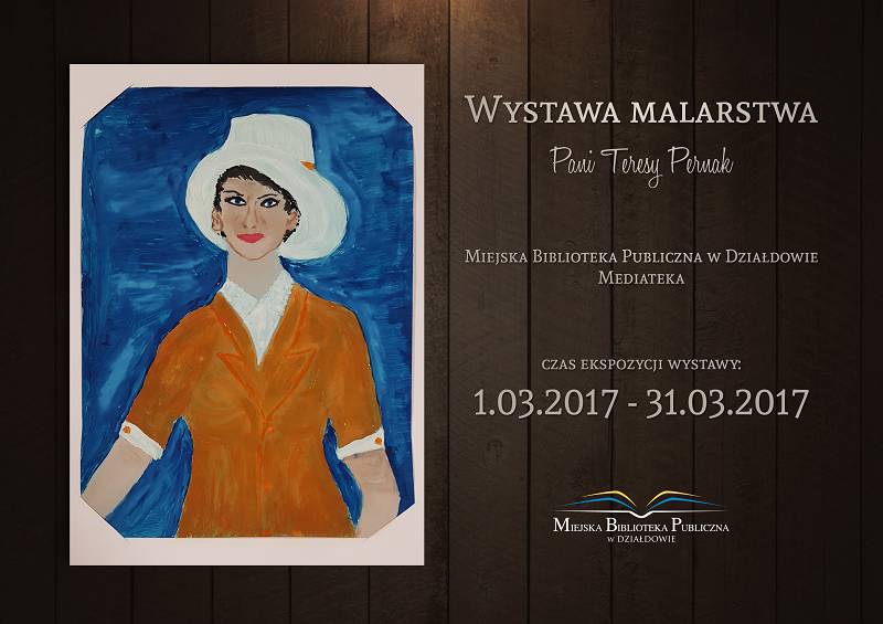 Miejska Biblioteka Publiczna w Działdowie zaprasza do zwiedzania Wystawy Malarstwa Teresy Pernak z Działdowa. Wystawę można zobaczyć w dziale Mediateka od 1 marca do 31 marca, w godzinach od 10.00 do 18.00, od poniedziałku do piątku oraz w sobotę od godz. 8.00 do 15.00. Autorka jest amatorką, emerytką i uczestniczką Dziennego Domu Senior-WIGOR w Działdowie. Informacja: Miejska Biblioteka Publiczna