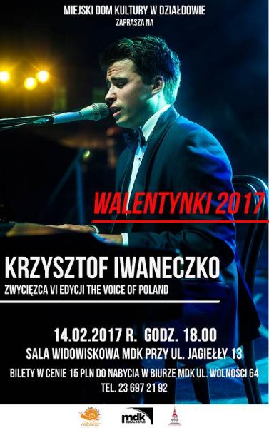 14 lutego o godz.18.00 w sali widowiskowej MDK w Działdowie przy ul. Jagieły 13, odbędzie się koncert walentynkowy z udziałem Krzysztofa Iwaneczko. Artysta jest zwycięzcą VI edycji telewizyjnego programu talent show, The Voice Of Poland. W Działdowie wystąpi w solowym recitalu, akompaniując sobie na pianinie. Materiał: Miejski Dom Kultury