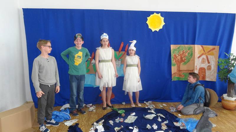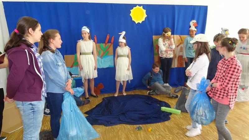 Społeczność placówki obejrzała również przedstawienie pt. "Gdzie jest nasze jezioro?". W rolę zwierząt cierpiących z powodu zanieczyszczeń z powodzeniem wcielili się uczniowie klas 4d,5b i 6d. Historia dobrze się skończyła, ponieważ z pomocą młodych ekologów tereny wokół jeziora zostały wysprzątane.