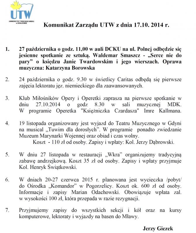 Komunikat Zarządu UTW z dnia 17.10. 2014 r.