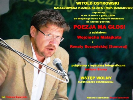 zapraszają w dn. 8 marca 2013 r., godz. 17:30, do Miejskiego Domu Kultury w Działdowie na wieczór poetycki: POEZJA MA GŁOS! z udziałem Wojciecha Malajkata i Renaty Buczyńskiej (Samoraj) połączony z wystawą fotograficzną Adriana Biemy ze spotkania z Krzysztofem Majchrzakiem, Wojciechem Kassem i Benedyktem Zygfrydem Perzyńskim.