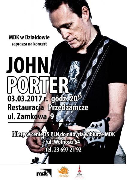 Miejski Dom Kultury w Działdowie zaprasza na koncert Johna Portera. Wydarzenie odbędzie się 3 marca o godz. 20.30 w sali Restauracji Przedzamcze w Działdowie, przy ul. Zamkowej 9.