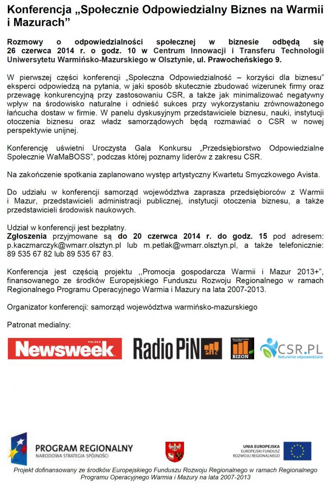 Rozmowy o odpowiedzialności społecznej w biznesie odbędą się 26 czerwca 2014 r. o godz. 10 w Centrum Innowacji i Transferu Technologii Uniwersytetu Warmińsko-Mazurskiego w Olsztynie, ul. Prawocheńskiego 9