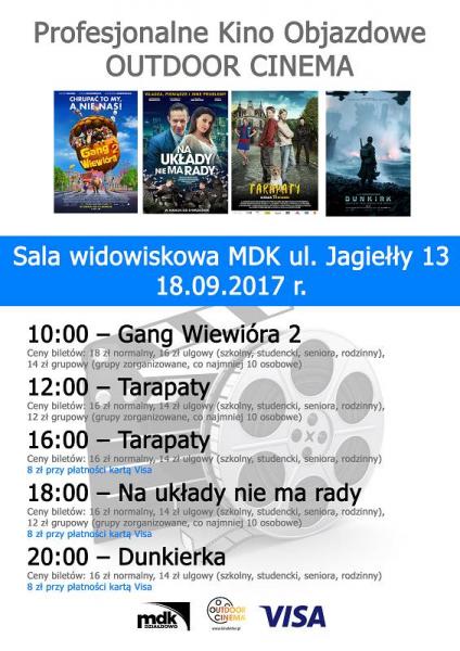 18 września 2017 r. (poniedziałek) w sali widowiskowej MDK w Działdowie przy ul. Jagiełły 13, odbędą się seanse Profesjonalnego Kina Objazdowego Outdoor Cinema. W tym dniu będziemy mogli obejrzeć w Działdowie cztery filmy, które w ostatnim czasie weszły na ekrany kin. Repertuar z linkami do przedsprzedaży zamieszczamy poniżej https://kino.visa.pl/trasa_kina/szczegoly/89 Przedsprzedaż on line kończy się na 24h przed startem seansu. Rezerwacji biletów (do późniejszego zakupu w kasie kina) można dokonywać telefonicznie, pod nr tel. (22) 357 78 00, od poniedziałku do piątku, w godz. 10:00-15:00. Wszystkie zarezerwowane bilety należy odebrać co najmniej pół godziny przed startem seansu. Użytkownicy kart Visa przy płatności tą kartą mają możliwość zakupu biletów normalnych i zestawów w barku kinowych z 50% zniżką! Kasa kina czynna w dniu przyjazdu od godziny 9.30. Informacja: Miejski Dom Kultury