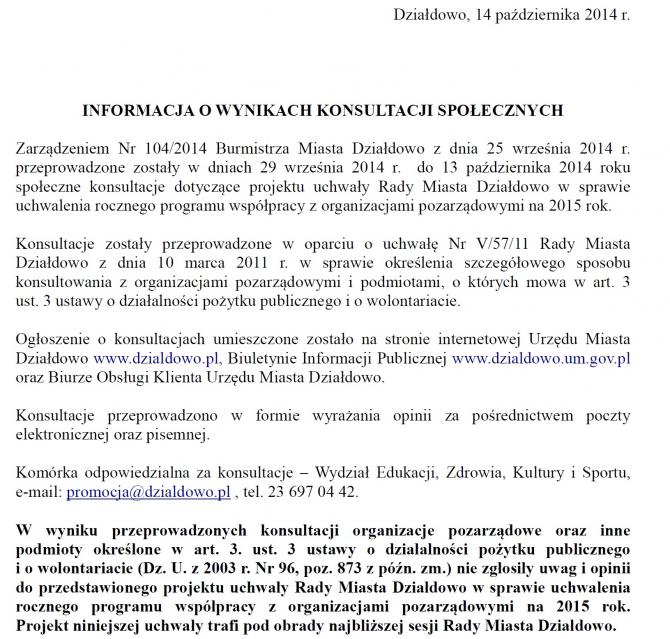Zarządzeniem Nr 104/2014 Burmistrza Miasta Działdowo z dnia 25 września 2014 r. przeprowadzone zostały w dniach 29 września 2014 r. do 13 października 2014 roku społeczne konsultacje dotyczące projektu uchwały Rady Miasta Działdowo w sprawie uchwalenia rocznego programu współpracy z organizacjami pozarządowymi na 2015 rok