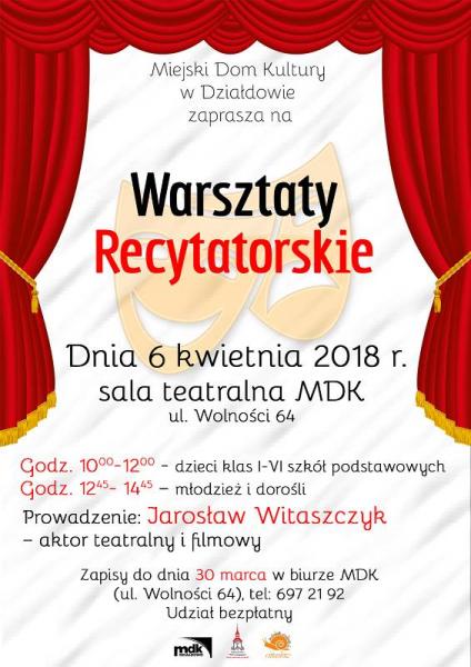 Zapraszamy wszystkich zainteresowanych do udziału w Warsztatach Recytatorskich, które odbędą się 6 kwietnia 2018 r. w Miejskim Domu Kultury w Działdowie. Zajęcia poprowadzi Jarosław Witaszczyk-aktor teatralny i filmowy.