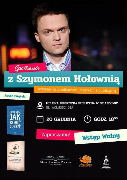 Miejska Biblioteka Publiczna w Działdowie ma zaszczyt zaprosić na ostatnie tegoroczne spotkanie autorskie, tym razem z Panem Szymonem Hołownią, głównie znanym z programu telewizyjnego "Mam Talent". Polski dziennikarz, pisarz i publicysta zagości do biblioteki 20 grudnia o godz. 18.00 w dziale Mediateka. Wszystkich serdecznie zapraszamy. Informacja: Miejska Biblioteka Publiczna