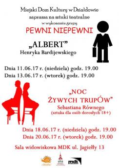 Dnia 11 czerwca (w niedzielę) pokażemy sztukę Henryka Bardijewskiego pt. "Albert". Jest to kameralna komedia utrzymana w tajemniczym, niepokojącym nastroju z elementami science fiction... Pewnego dnia w życiu młodego małżeństwa pojawia się nieznany wuj Albert, który odkrywa prawdziwe oblicze dwójki egoistycznych bohaterów. Sztukę powtórzymy we wtorek - 13 czerwca. Dnia 18 czerwca (w niedzielę) zaprezentujemy sztukę Sebastiana Równego pt. "Noc żywych trupów". Tekst został nagrodzony w IV Ogólnopolskim Konkursie Dramaturgicznym "Lustro. Obraz. Iluzja" odbywającym się w ramach Forum Współczesnego Dramatu 2008. Sebastian Równy ukończył filologię klasyczną, dlatego w sztuce wykorzystuje chór i "deus ex machina"... Sztuka jest bardzo skondensowana i poruszająca. Opowiada o spotkaniu mężczyzny i kobiety w plastikowym świecie wielkich korporacji. Jest oskarżeniem i ostrzeżeniem.... Spektakl przeznaczony jest wyłącznie dla widzów dorosłych. Powtórka - 20 czerwca. Informacja: Miejski Dom Kultury