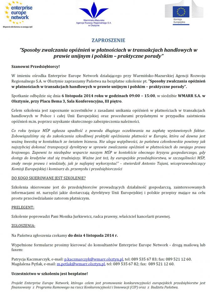 Zaproszenie na bezpłatne szkolenie - "Sposoby zwalczania opóźnień w płatnościach w transakcjach handlowych w prawie unijnym i polskim - praktyczne porady"
