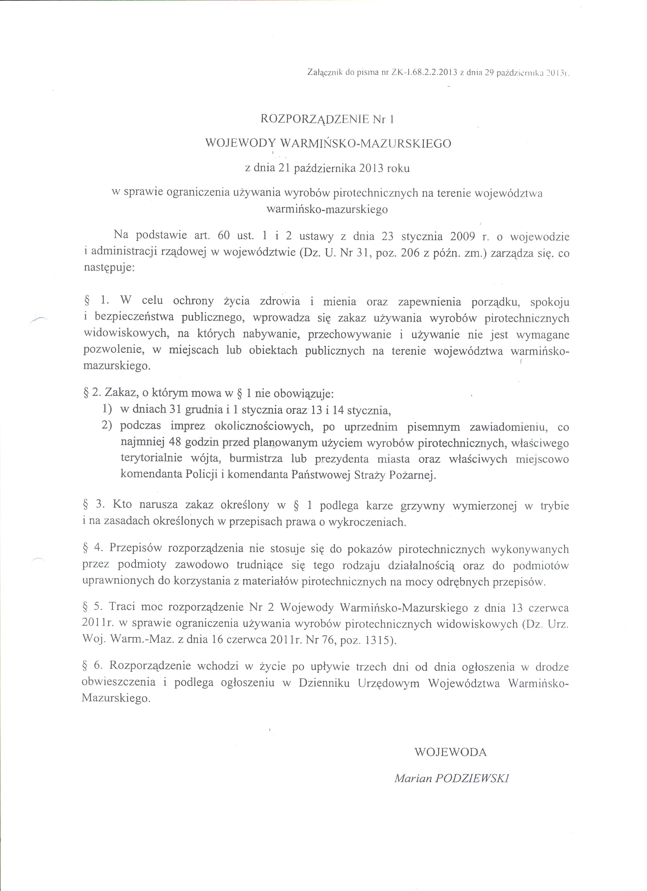 W związku z wydanym przez Wojewodę Warmińsko-Mazurskiego Rozporządzeniem Nr 1 z dnia 21 października 2013 roku w sprawie ograniczenia używania wyrobów pirotechnicznych na terenie województwa warmińsko-mazurskiego, został wprowadzony zakaz używania środków pirotechnicznych widowiskowych, na których nabywanie, przechowywanie i używanie nie jest wymagane pozwolenie, w miejscach lub obiektach publicznych na terenie naszego województwa.