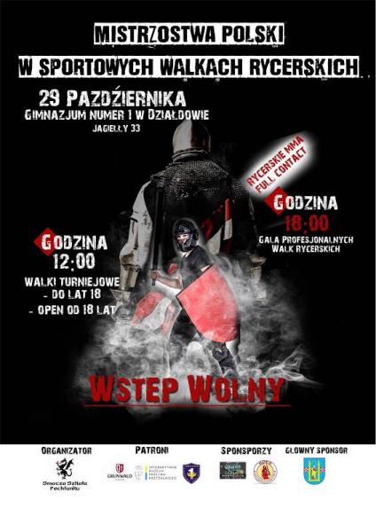 Smocza Szkoła Fechtunku z Działdowa, działająca przy Bractwie Rycerskim Komturii Nidzickiej, zaprasza na pierwsze w historii Działdowa Mistrzostwa Polski w Sportowych Walkach Rycerskich. Wydarzenie odbędzie się 29 października 2016 r. w Gimnazjum nr 1, ul. Jagiełły 33.