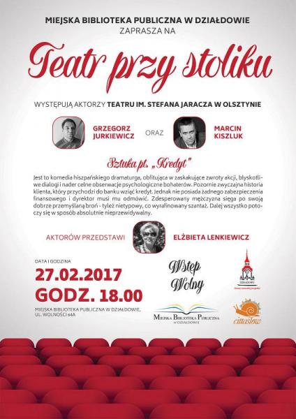 Aktorzy Teatru im. Stefana Jaracza w Olsztynie w Miejskiej Bibliotece Publicznej w Działowie przedstawią sztukę czytaną pt. "Kredyt".