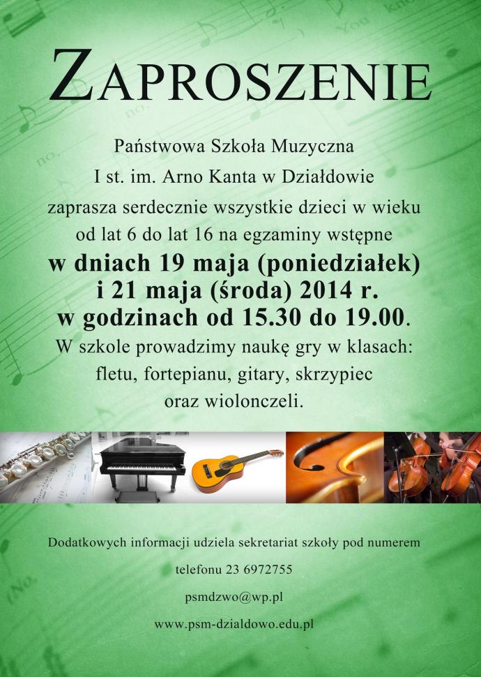 Państwowa Szkoła Muzyczna I st. im. Arno Kanta w Działdowie zaprasza serdecznie wszystkie dzieci w wieku od lat 6 do lat 16 na egzaminy wstępne